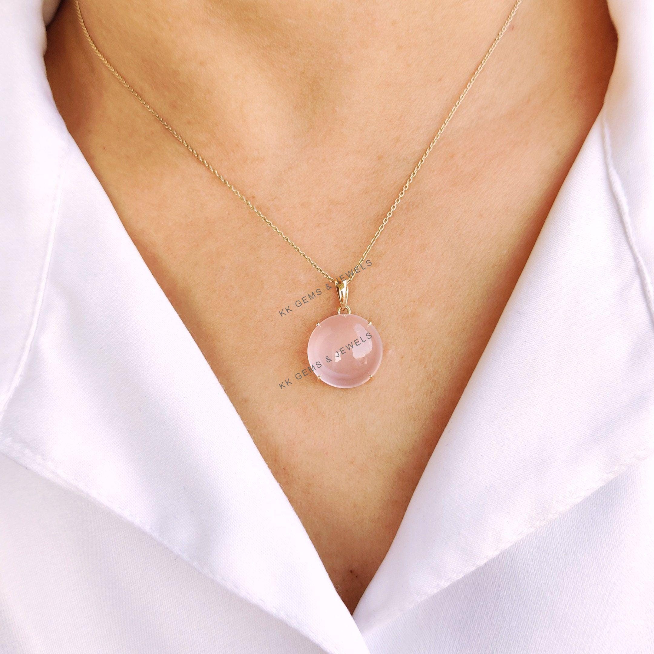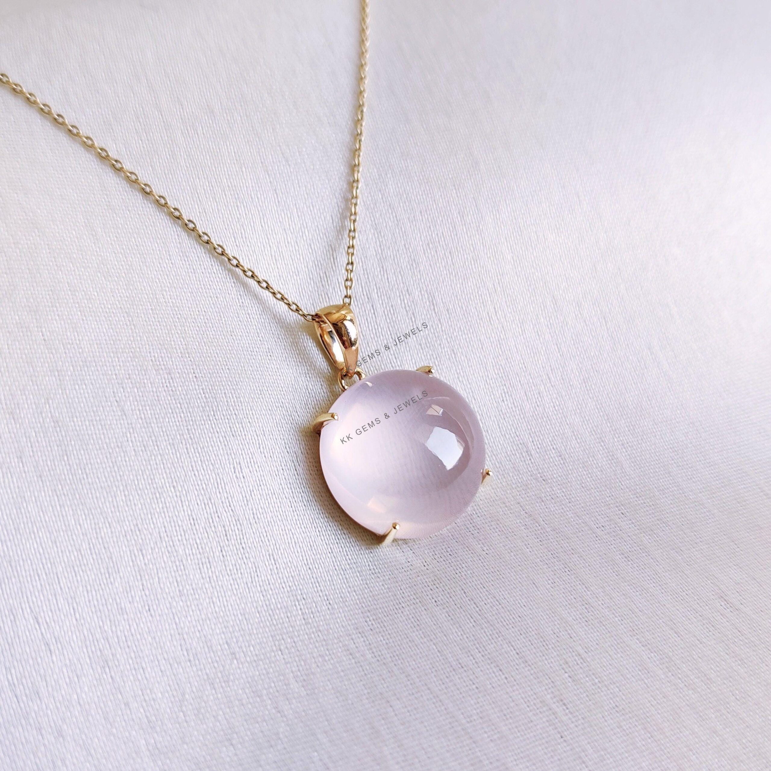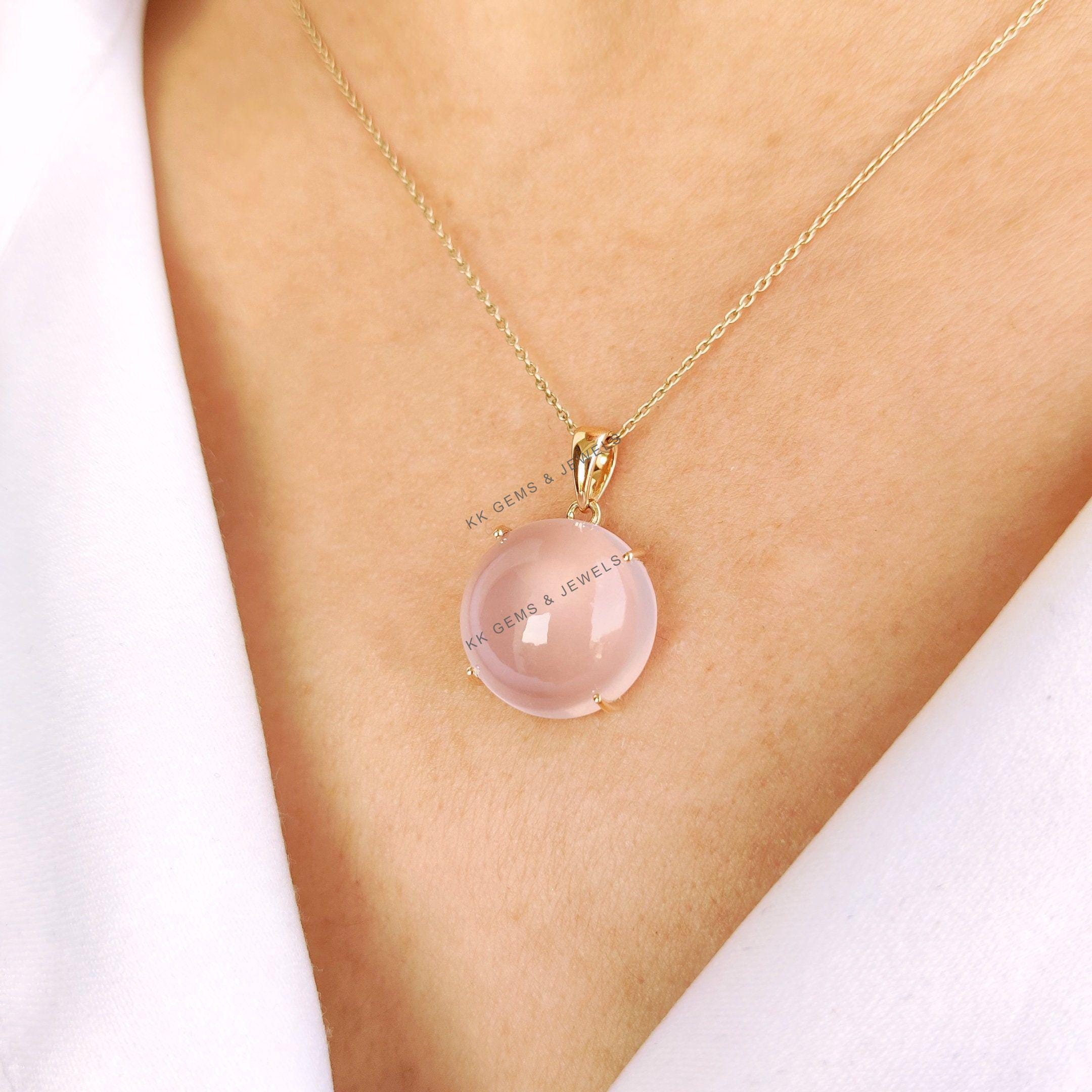 Round Cabochon Natural Rose Quartz Pendant, Birthstone Pendant Set in 14K Solid Gold