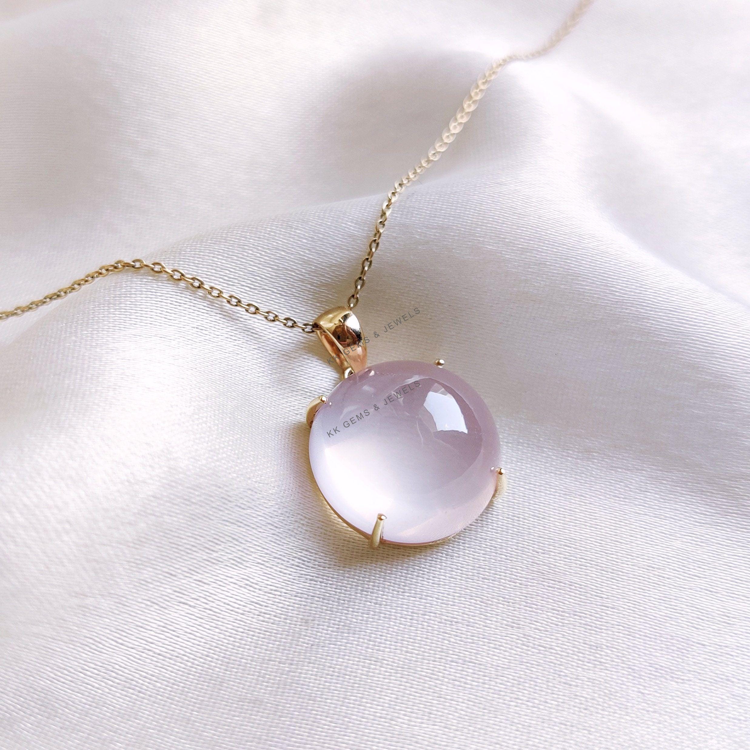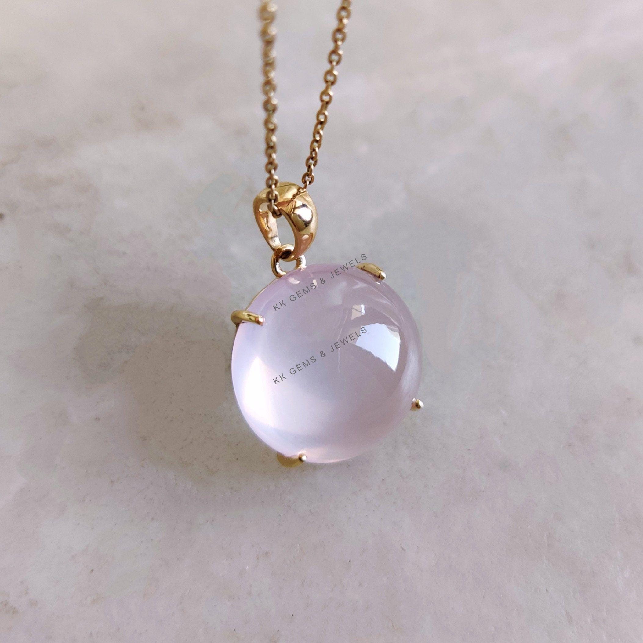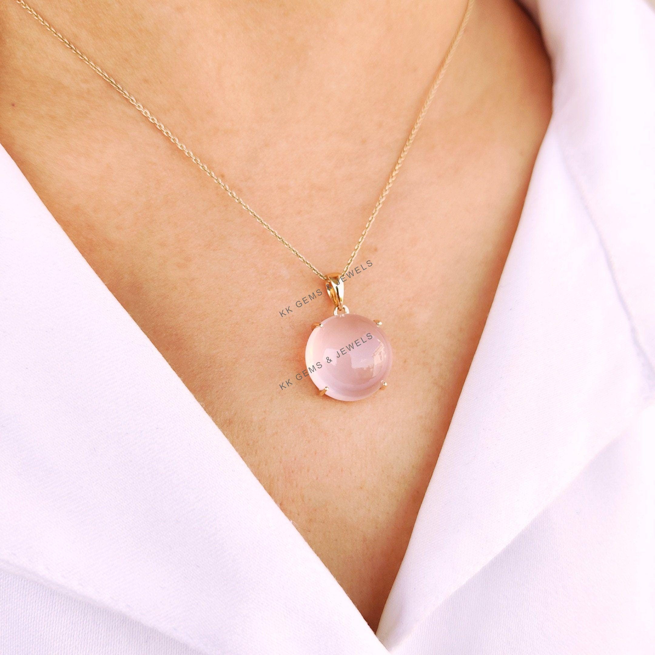 Round Cabochon Natural Rose Quartz Pendant, Birthstone Pendant Set in 14K Solid Gold