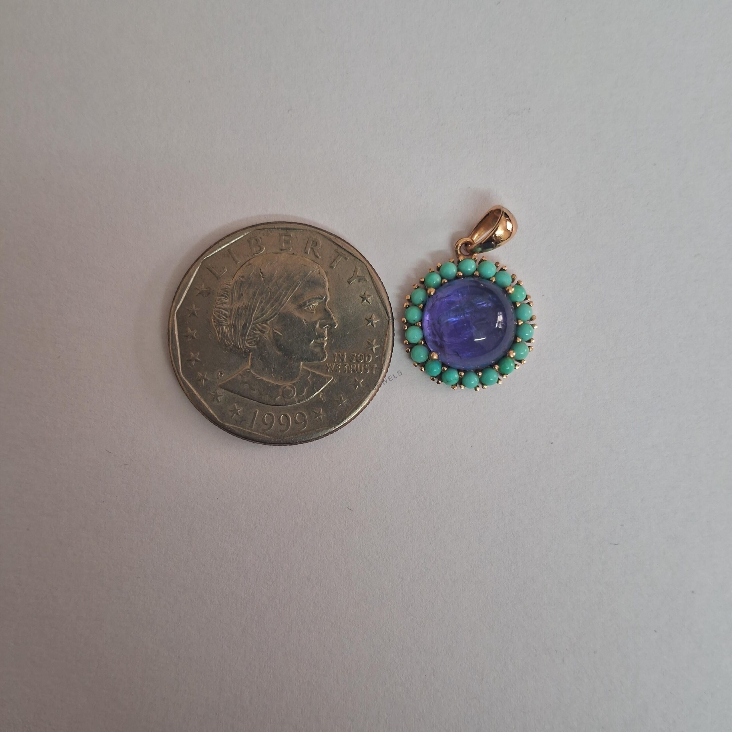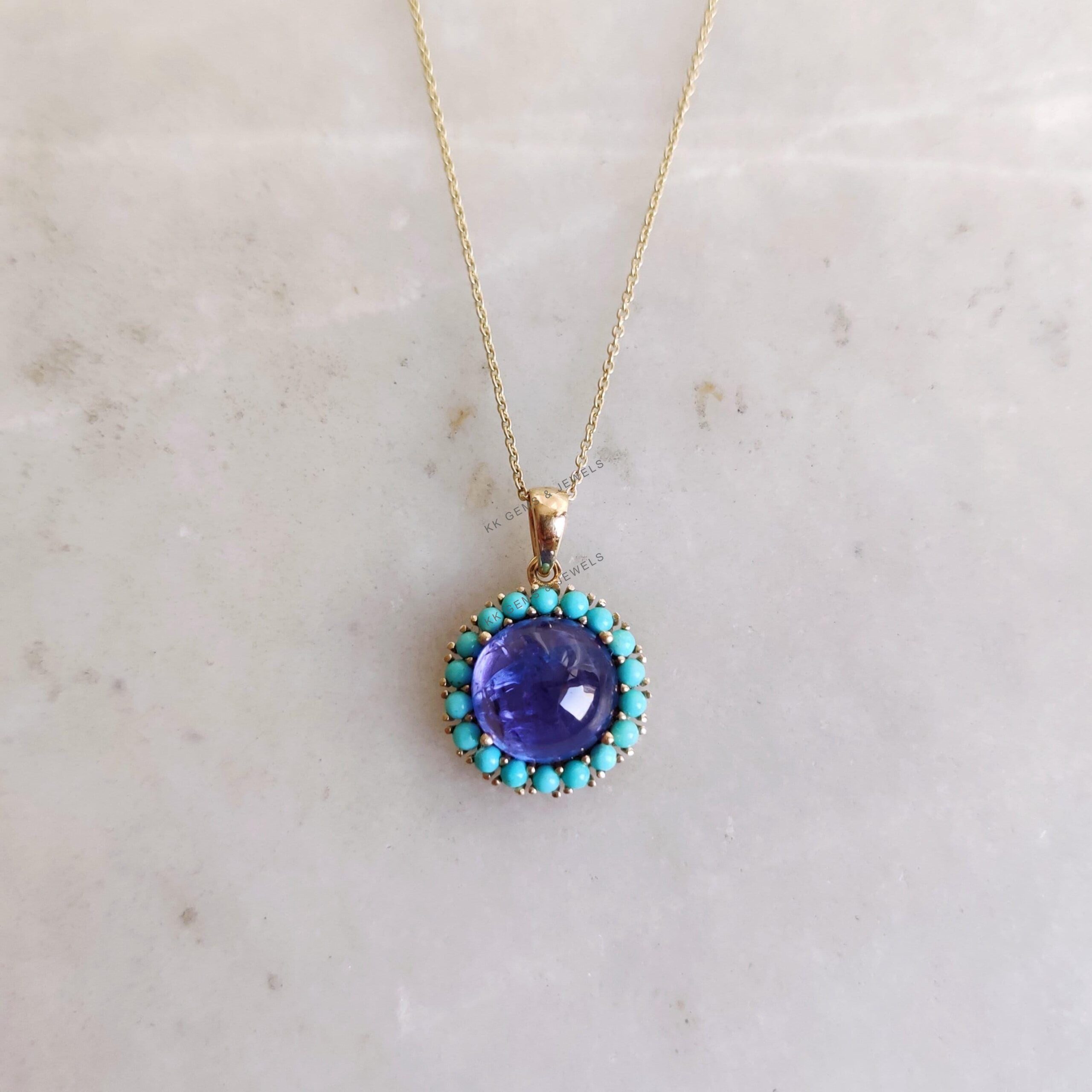 Round Cabochon Natural Tanzanite Multi Stone Pendant Set in 14K Solid Gold