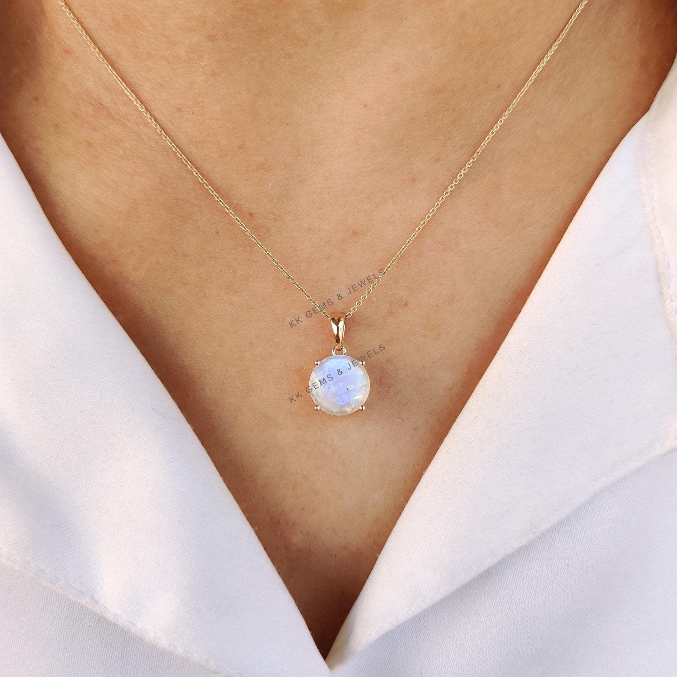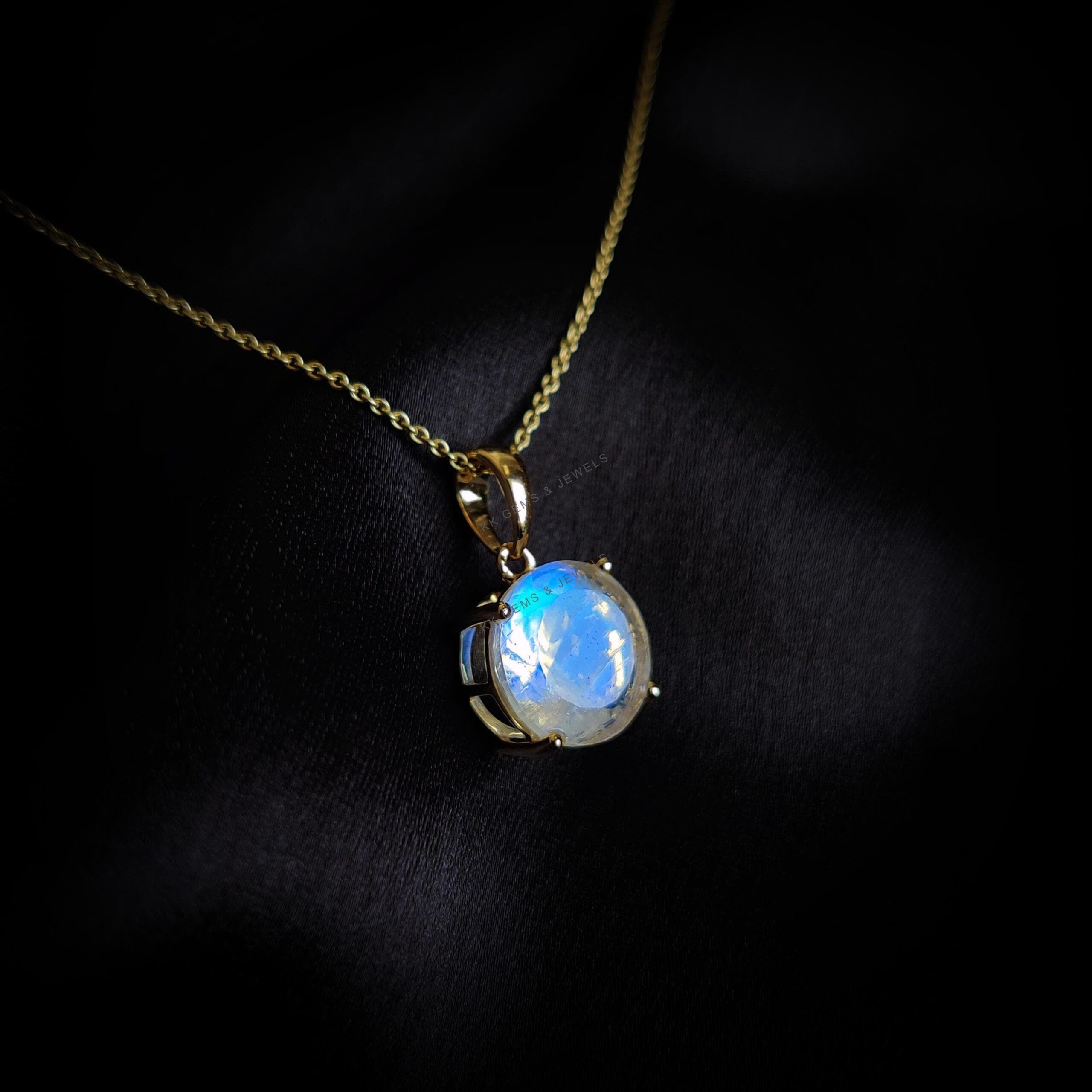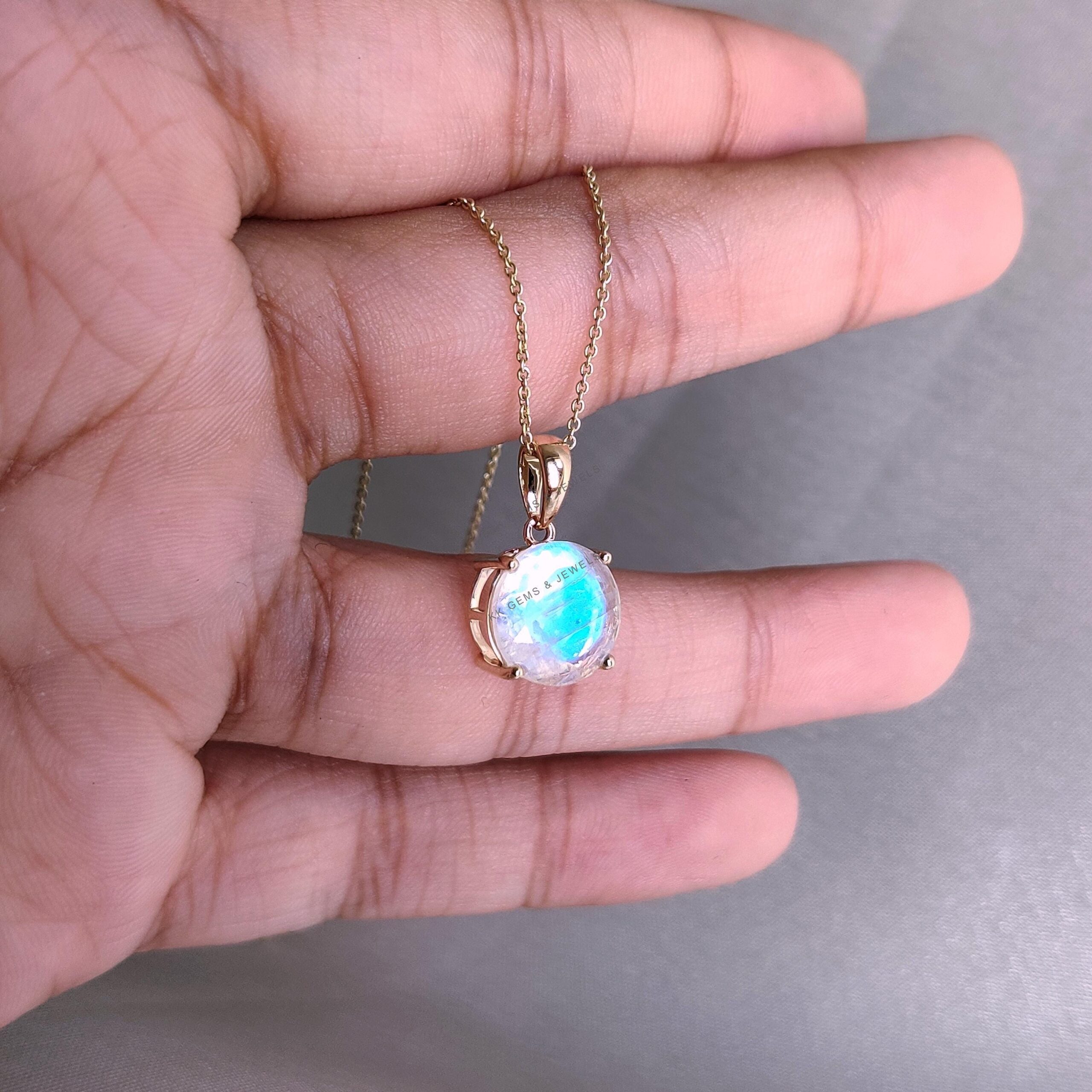 Round Cut Natural Rainbow Moonstone Pendant Set in 14K Solid Gold, June Birthstone