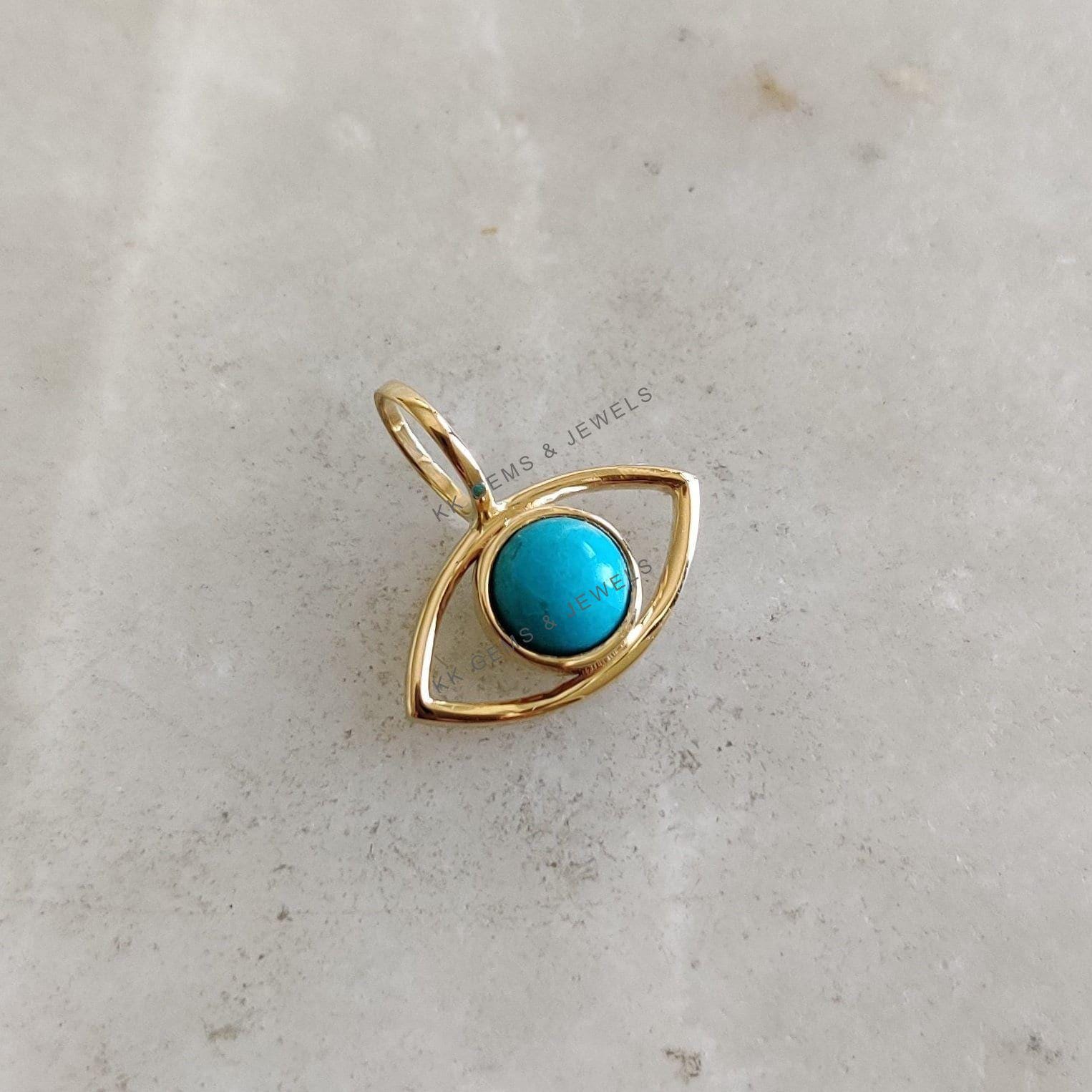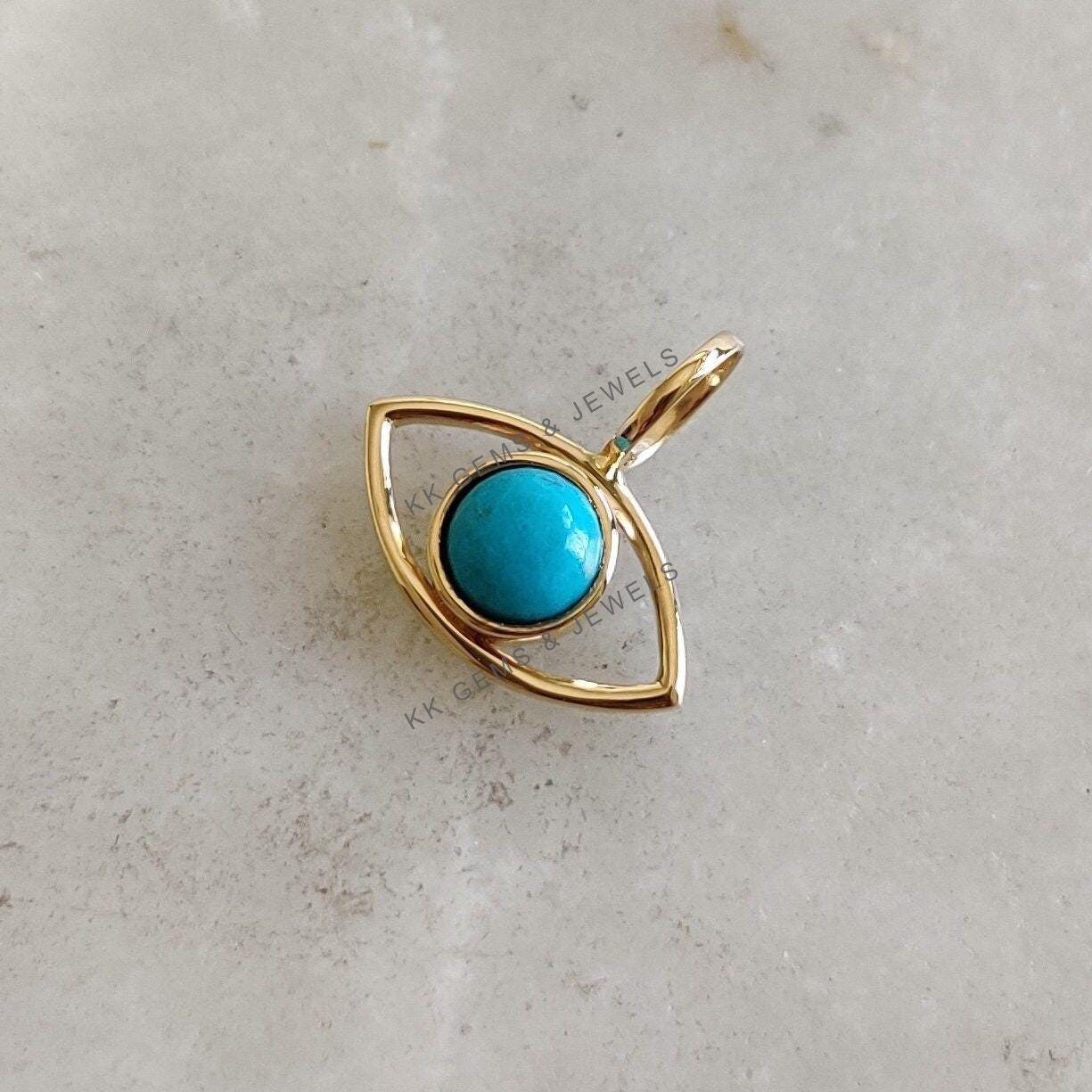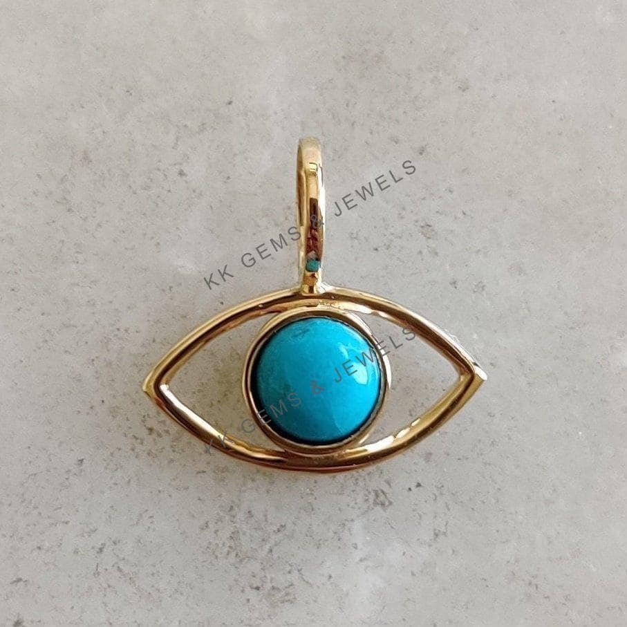 Natural Arizona Turquoise Pendant Set in 14K Solid Yellow Gold, Evil Eye Charm