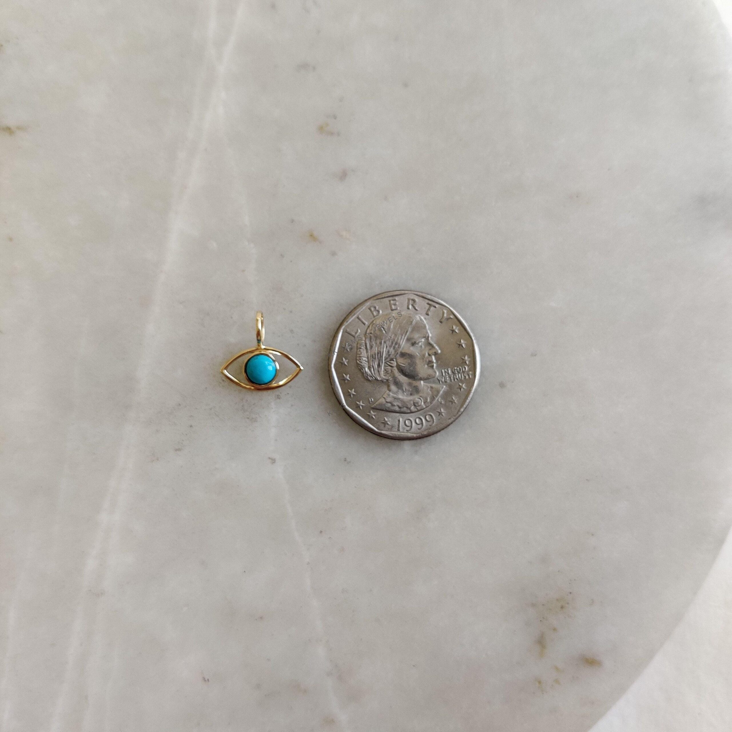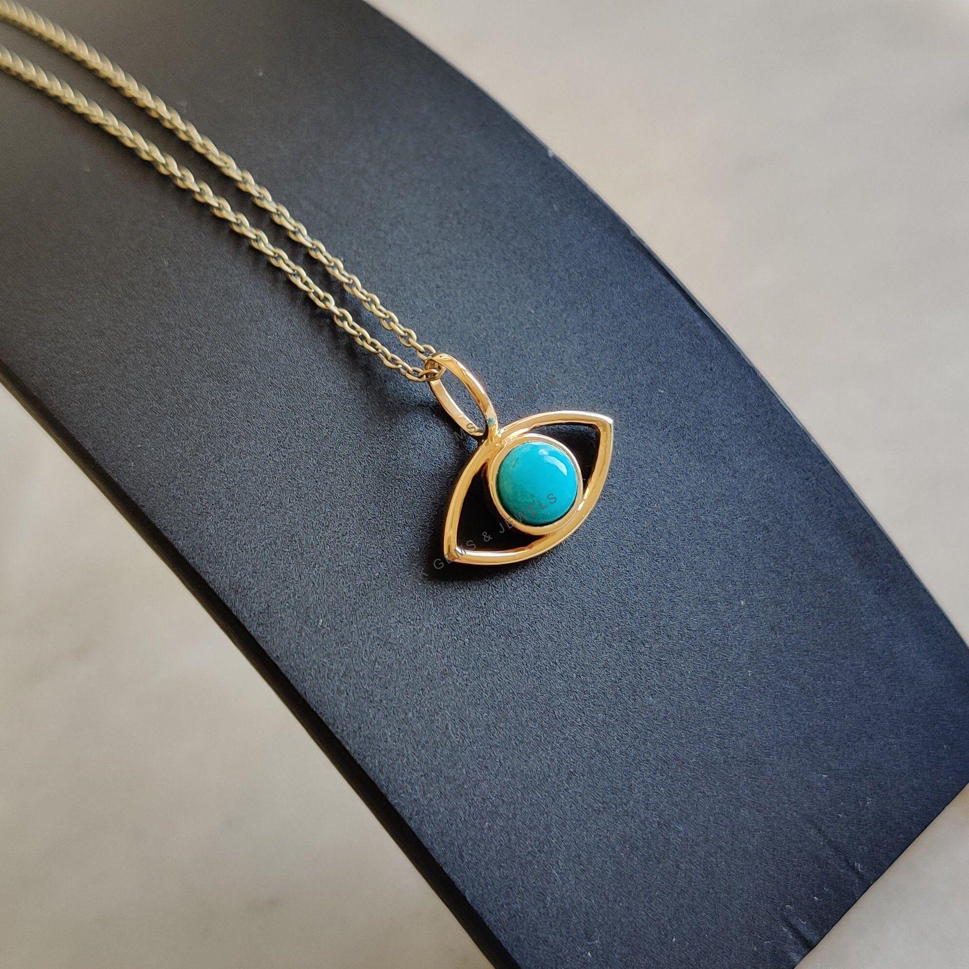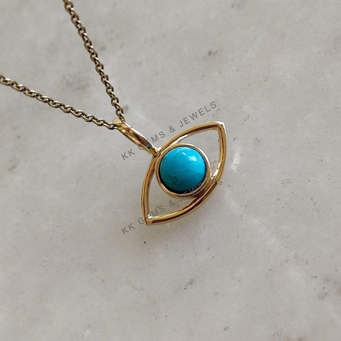 Natural Arizona Turquoise Pendant Set in 14K Solid Yellow Gold, Evil Eye Charm