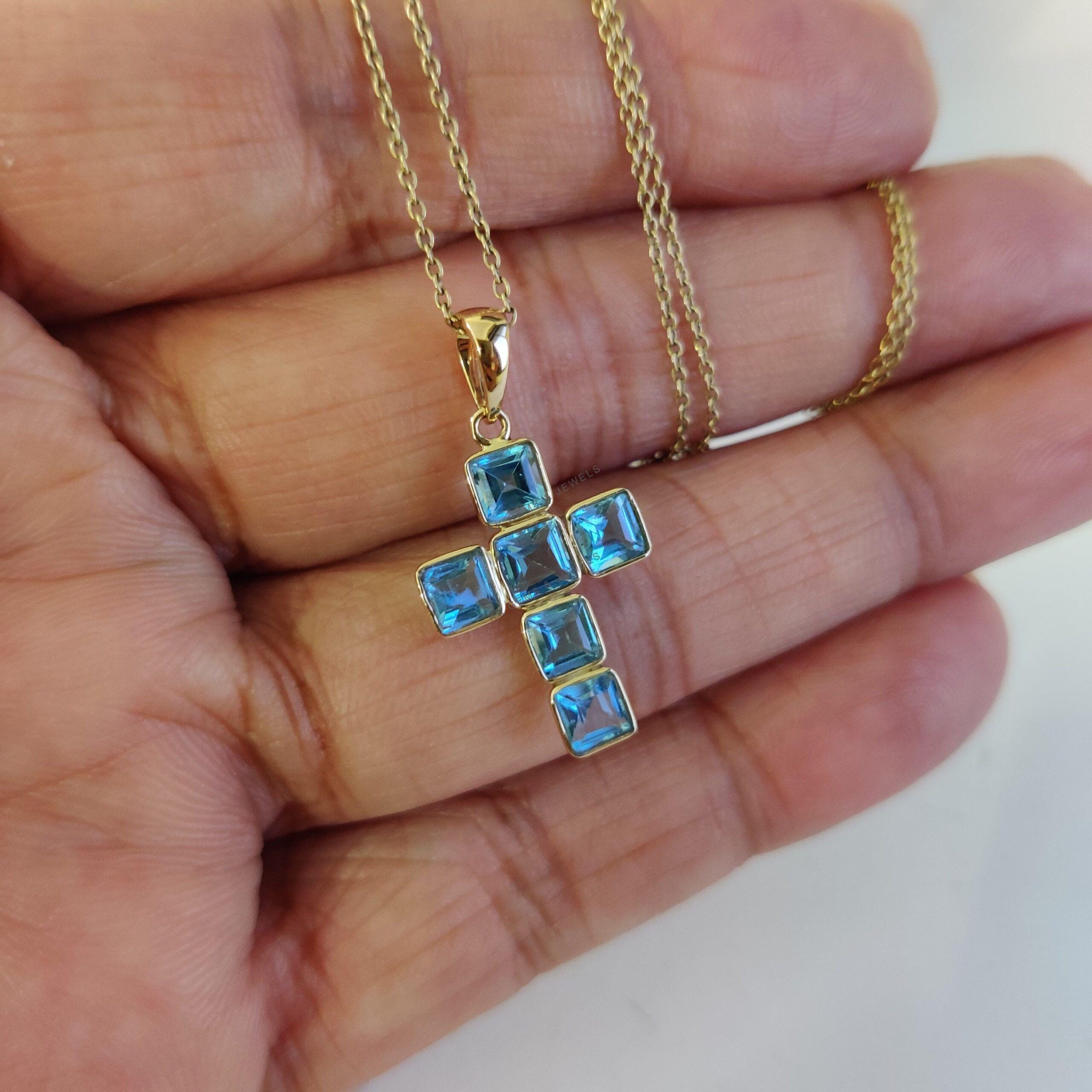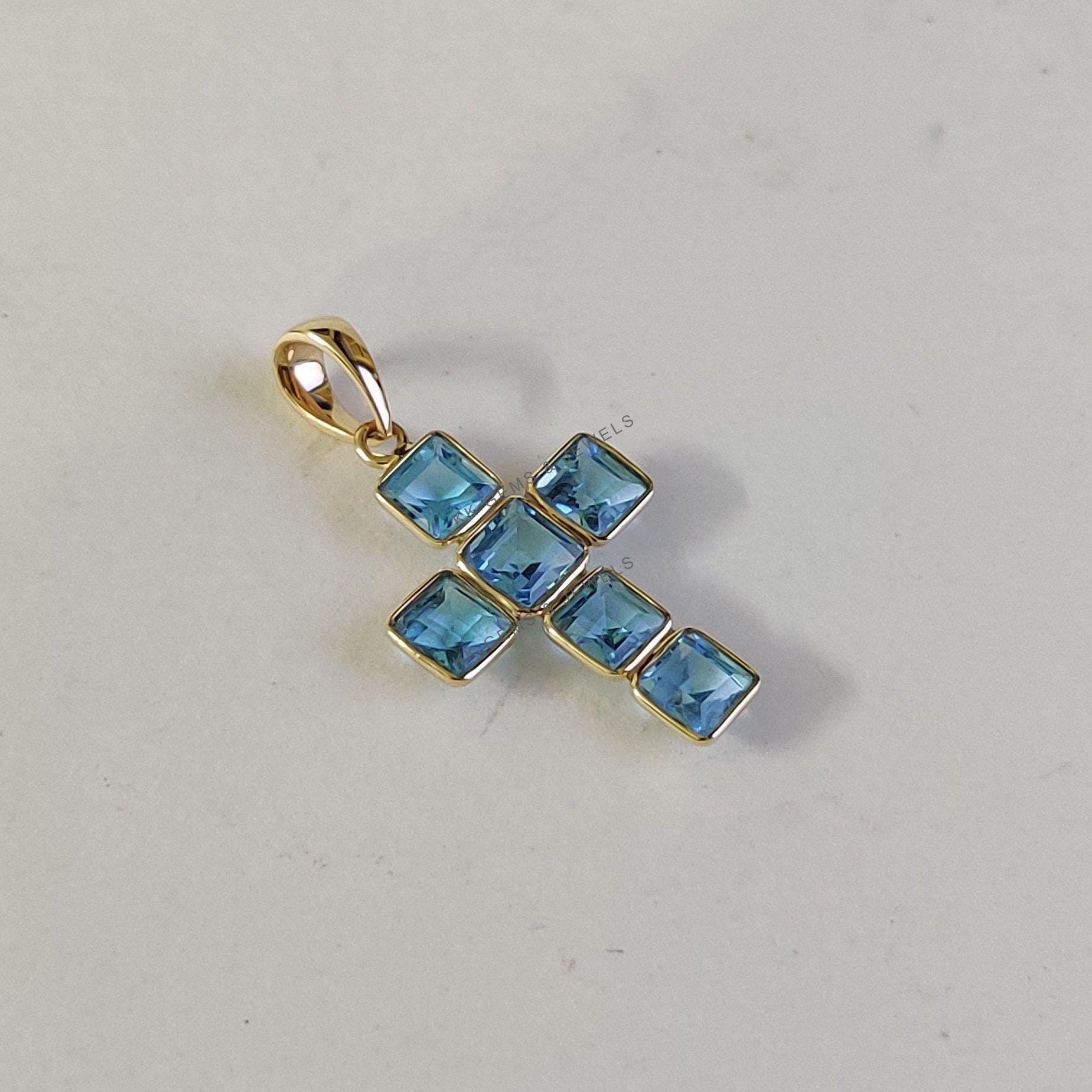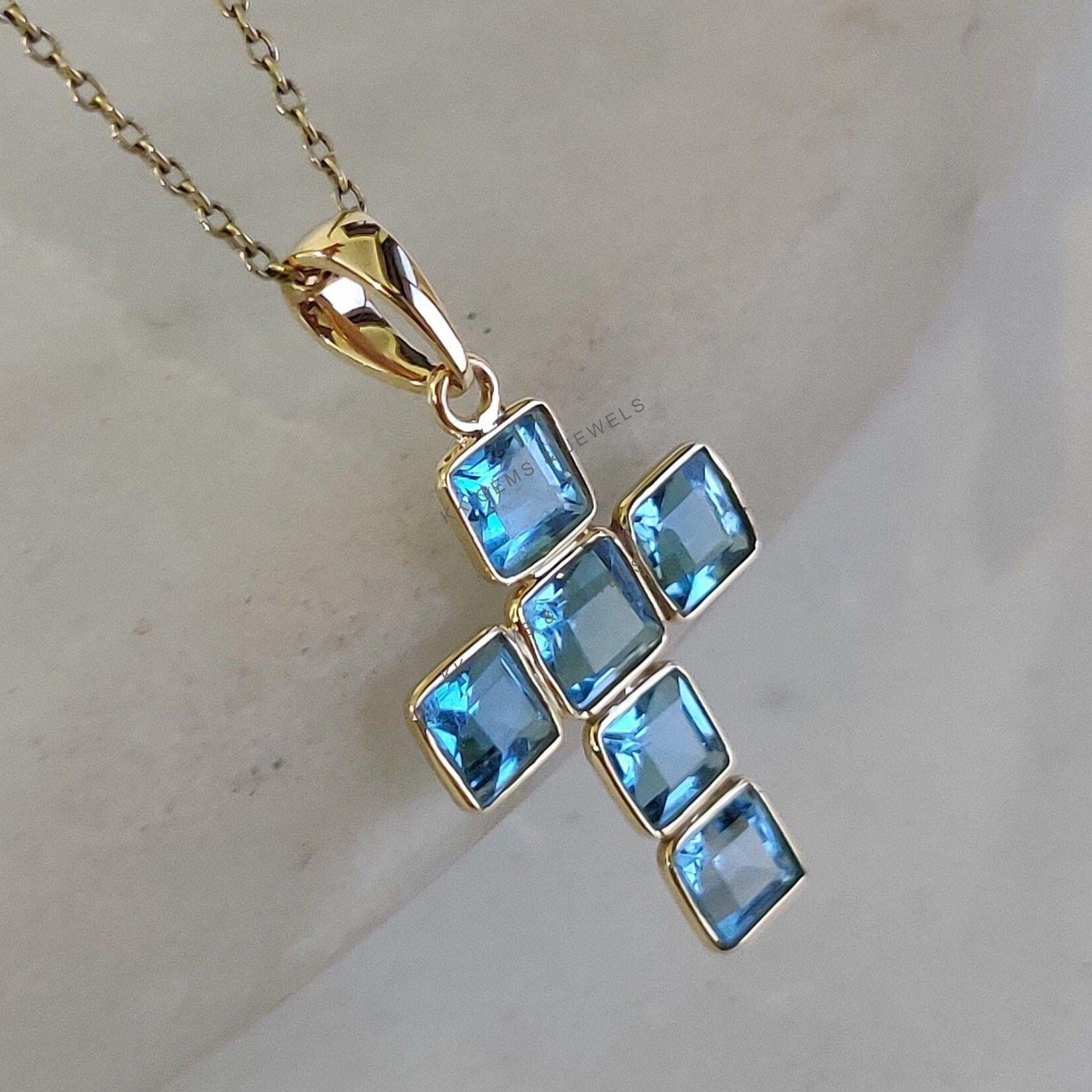 2 reviews for Square Cut Natural Swiss Blue Topaz Cross Pendant Set in 14K Solid Gold