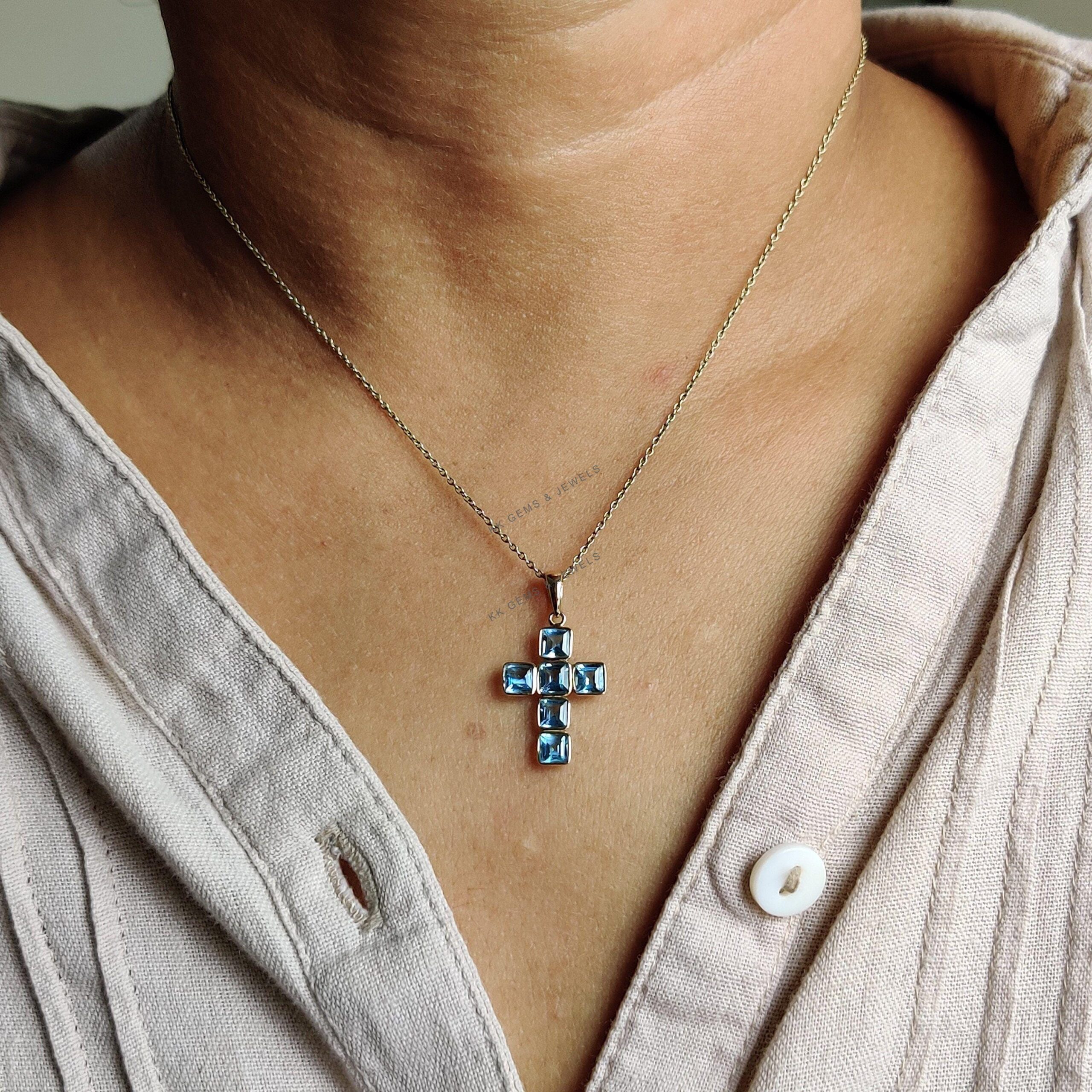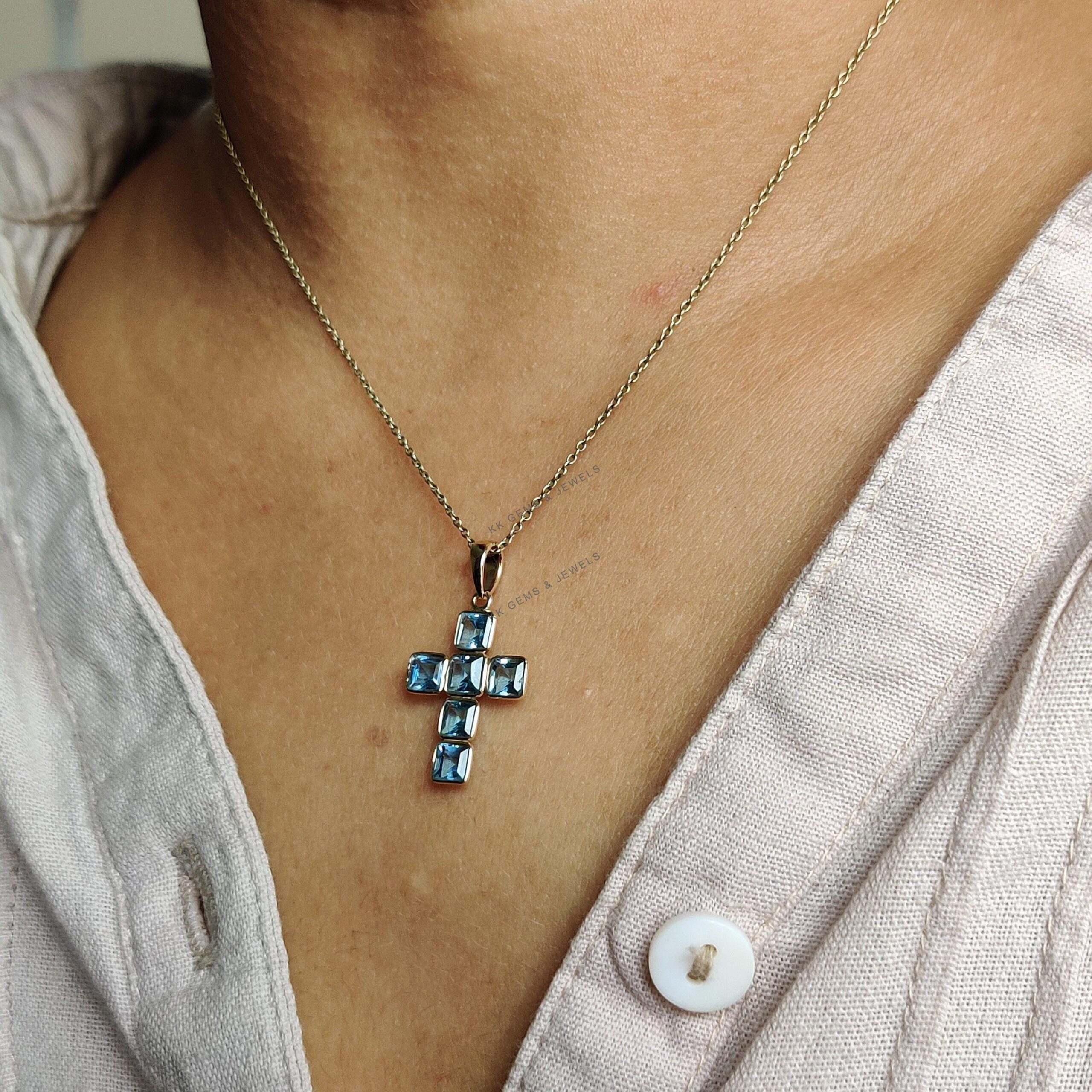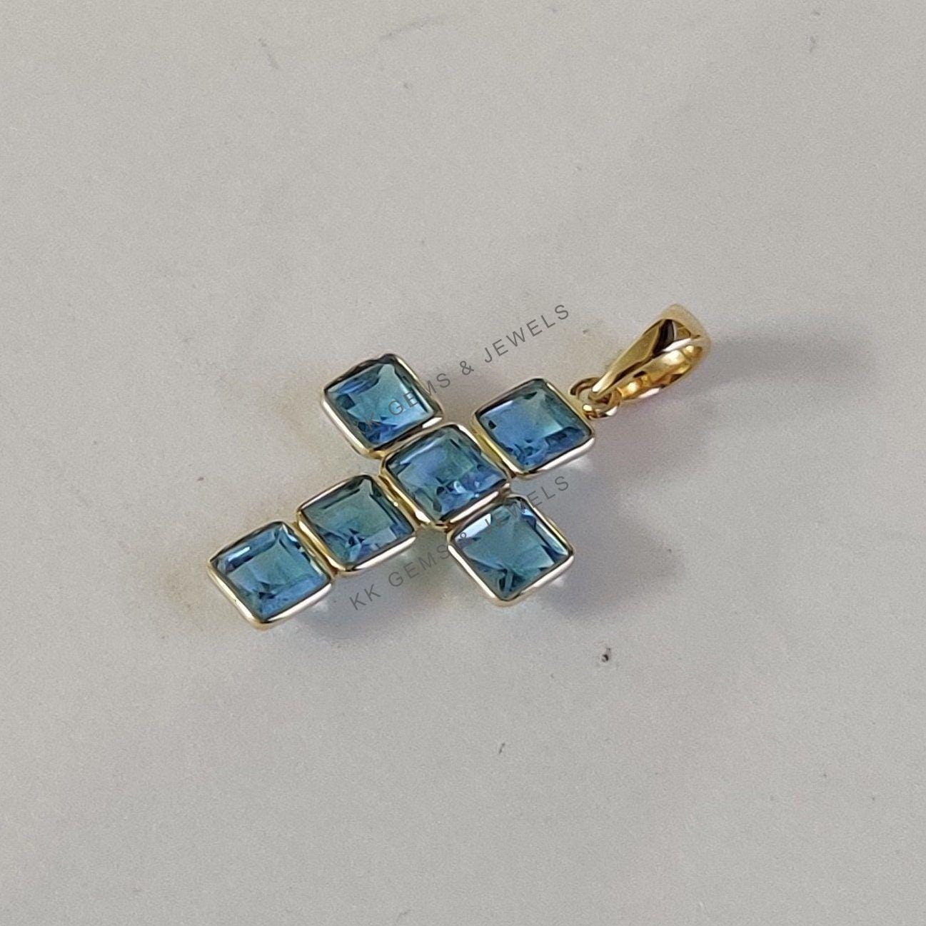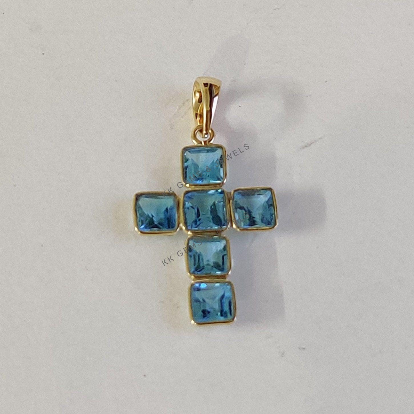 2 reviews for Square Cut Natural Swiss Blue Topaz Cross Pendant Set in 14K Solid Gold