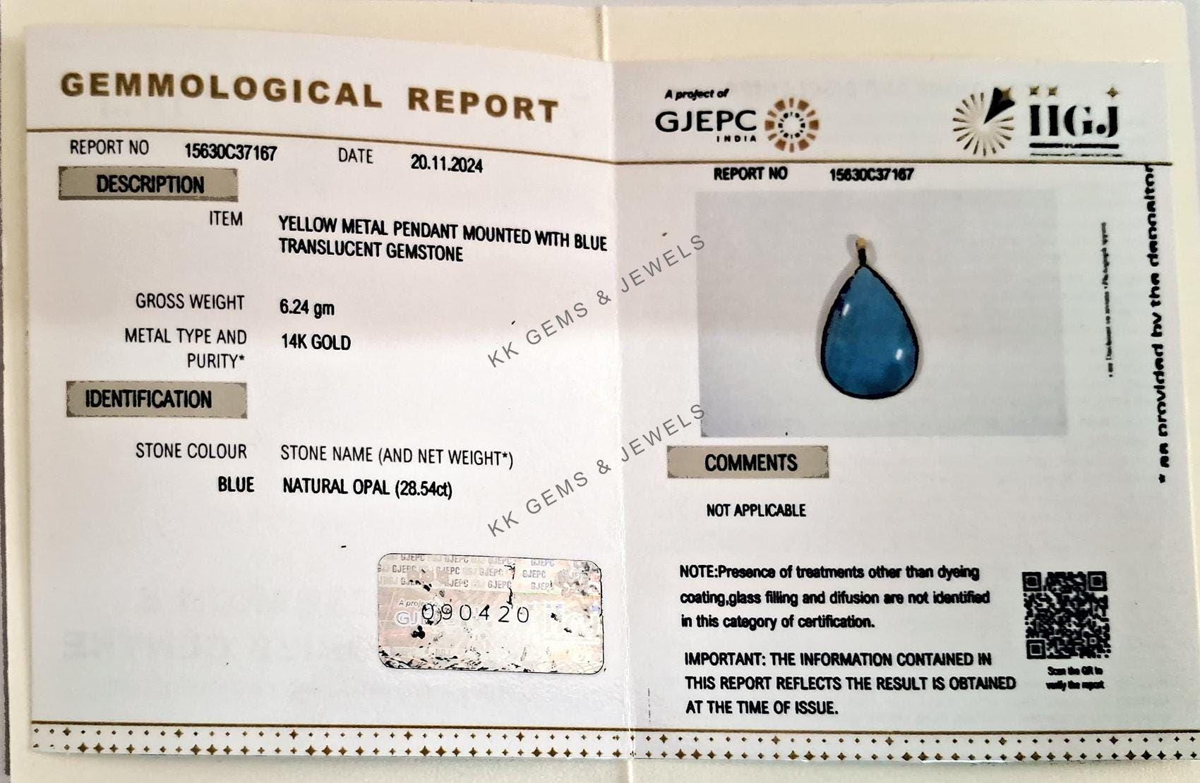 This stunning pendant is set in 14K Solid Yellow Gold with Natural Blue Opal with utmost precision. It is an unique gemstone pendant for nearly every occasion and is completely hassle-free jewelry.